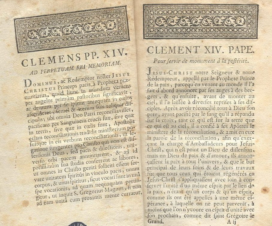 В 1773 году Климент XIV опубликовал буллу (Dominus ac Redemptor), в которой постановил распустить ОбществоИисуса, являвшееся в течение двух веков опорой папства и главной движущей силой контрреформации.